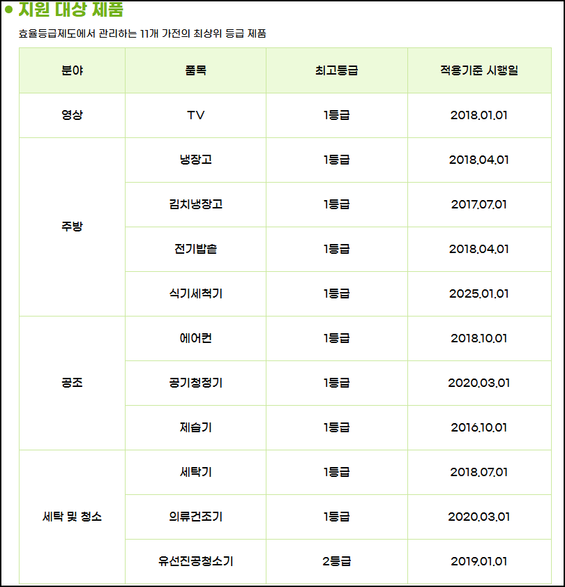 아래 목록에 있는 가전제품들이 환급 대상 가전제품입니다. '최고등급'과 '적용기준 시행일'을 반드시 확인해야 합니다!
