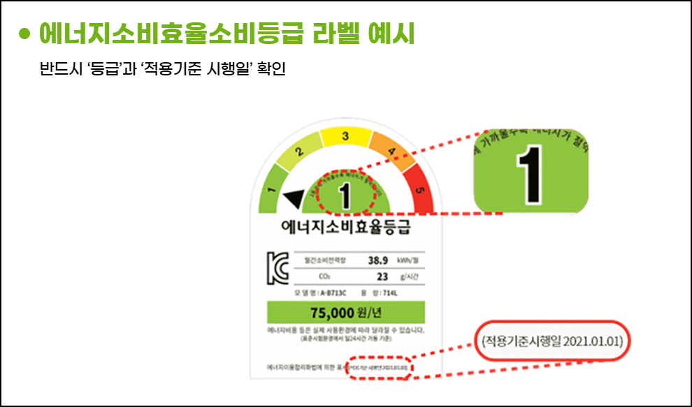 최고등급과 적용기준 시행일에 관한 정보는 가전제품에 부착되어 있는 스티커에서 확인하실 수 있습니다. 아래 사진을 참고하세요.