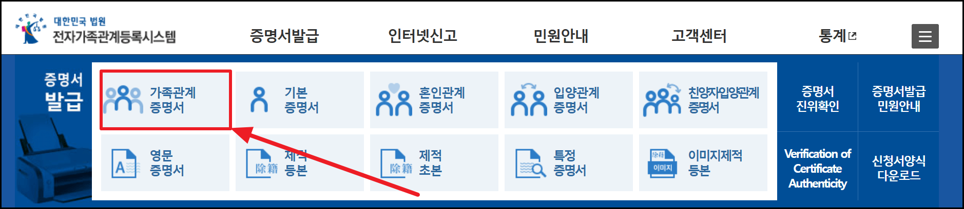 가족관계증명서는 대한민국 법원 전자가족관계등록시스템에서 발급받으실 수 있습니다.