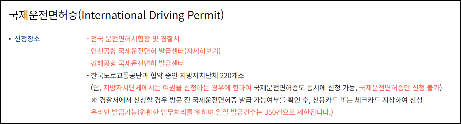 - 국제운전면허증 온라인 발급 신청 시, 하루에 350건만 신청을 받으니, 가능한 빨리 신청을 하시는 것을 추천드립니다. 신청 가능 시간은 아침 7시 30분부터 밤 10시까지입니다.