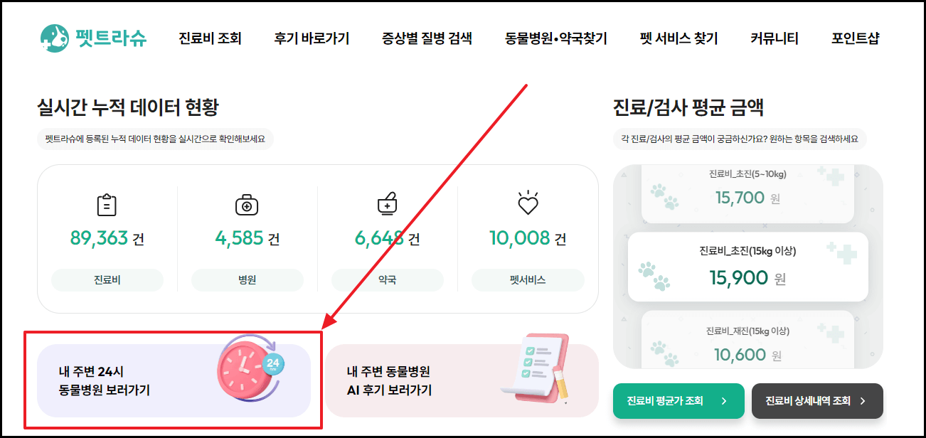 24시간 운영하는 동물병원을 찾는 방법은 정말 간단합니다. 펫트라슈라는 홈페이지에서 바로 확인하실 수 있는데요. 펫트라슈는 반려동물을 키우는 분들이 알아두면 유용한 사이트로 각종 진료비, 펫 서비스, 동물병원 등에 관한 정보를 제공하는 곳입니다.