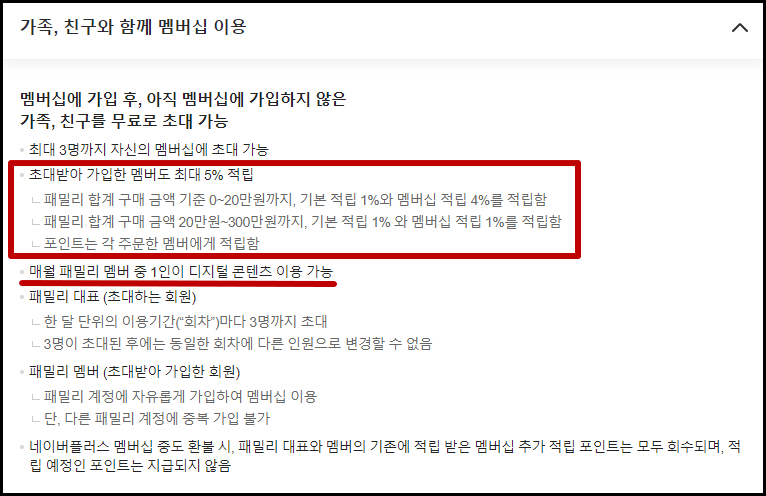 디지털 콘텐츠 무료 이용은 매월 패밀리 멤버 중 1인만 이용 가능합니다! 또한, 네이버플러스 멤버십을 중도에 환불하게 되면, 그동안 적립받은 멤버십 추가 적립 포인트가 모두 회수되며 적립 예정인 포인트 또한 지급되지 않는다는 점, 주의해 주세요.