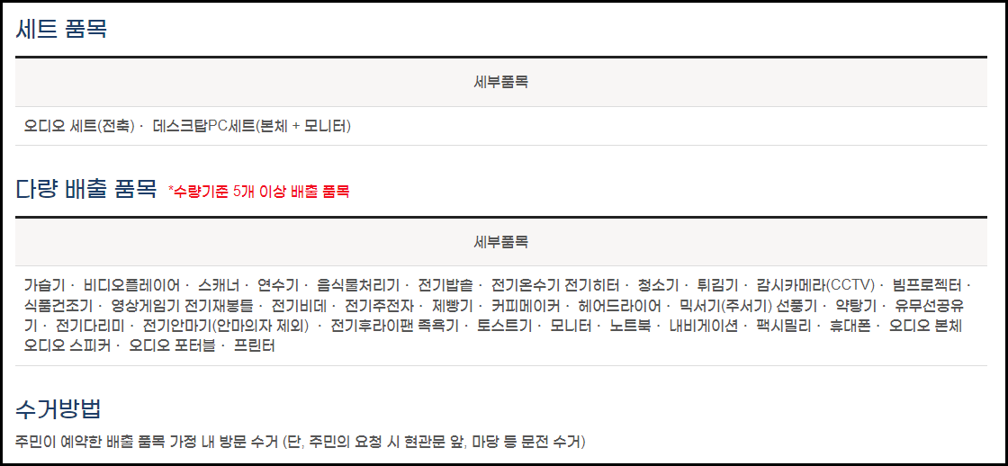 수거가 가능한 단일 품목 및 세트 품목, 다량 배출 품목은 아래와 같으며, 수거는 가정 내 방문 수거로 진행됩니다. 단, 신청자가 원할 시에는 현관문 앞 혹은 마당 등 문전 수거 또한 가능합니다.