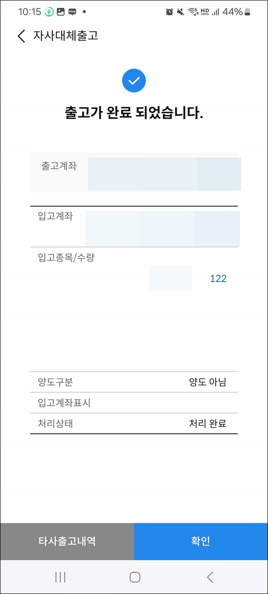 ⑦ '출고실행'을 클릭함과 동시에 주식 대체출고가 완료됩니다.