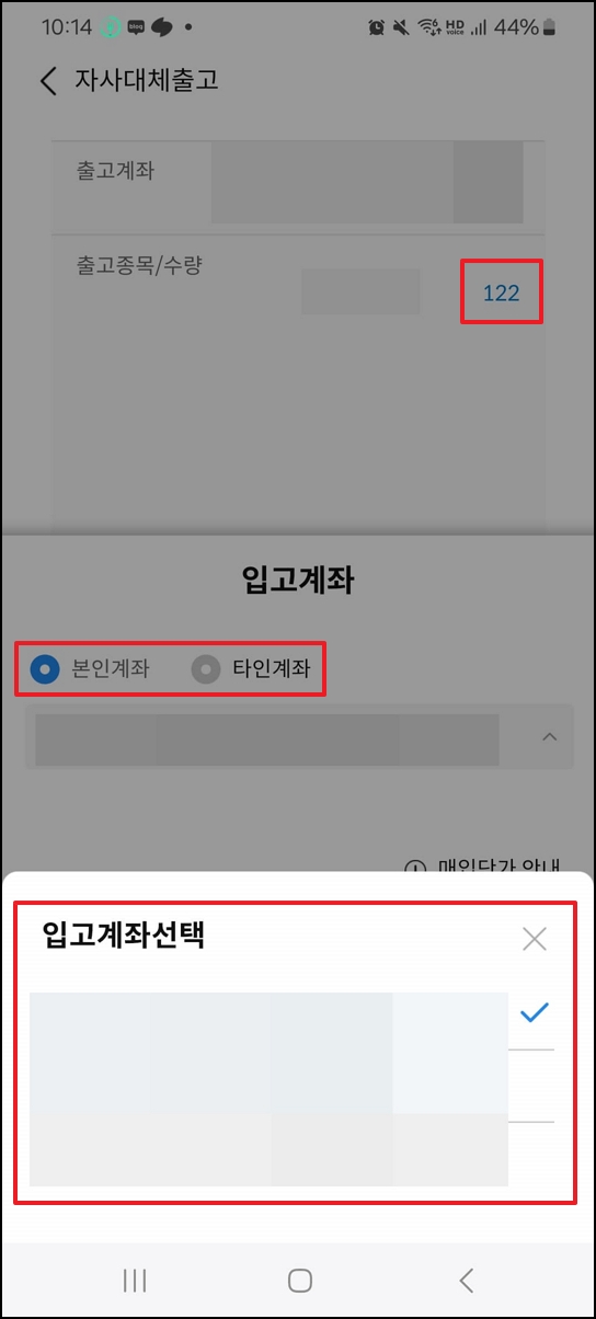 - 입고계좌 선택