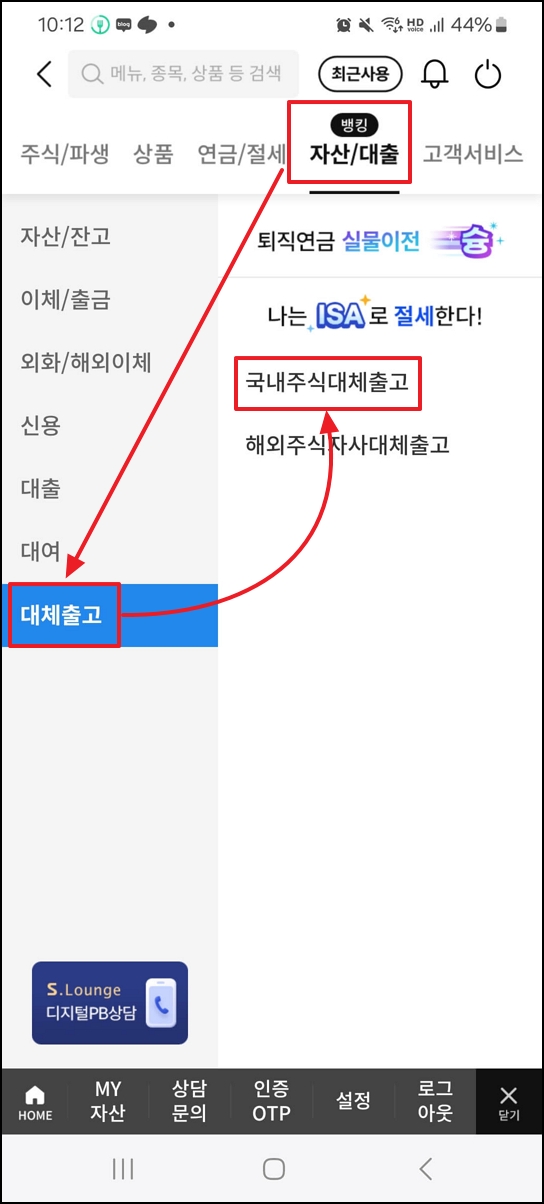 ① 삼성증권 앱 실행 후, 로그인합니다. 화면 하단에 있는 메뉴 탭을 클릭한 후, 자산/대출 ▷ 대체출고 ▷ 국내주식대체출고를 클릭합니다.