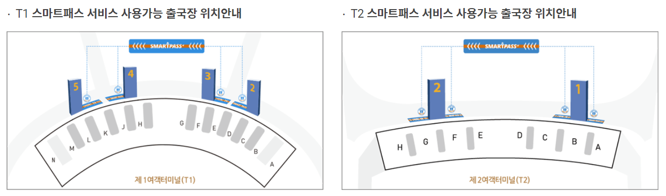 1터미널과 2터미널의 스마트패스 전용 게이트는 아래 사진에 자세히 나와 있으니 해당 게이트에 가셔서 스마트패스를 통해 출국장으로 입장하시기 바랍니다.