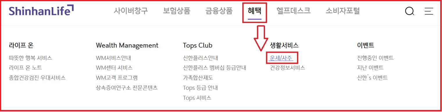 신한생명 무료운세를 보시려면 신한라이프 홈페이지에 방문하시면 됩니다. 사이트에 방문하셔서 [혜택] 탭을 누르신 후, [운세/사주]를 누르시면 됩니다. 바로 운세를 확인하시고 싶으신 분은 아래를 봐 주세요!