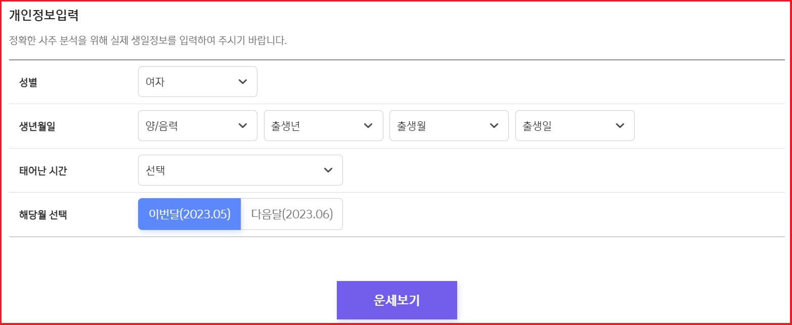 운세를 보는 방법도 더할 나위 없이 간단합니다. 위의 내용 중, 여러분들이 확인하고 싶은 운세를 클릭한 후, 성별과 생년월일, 태어난 시간만 입력하면 끝입니다.