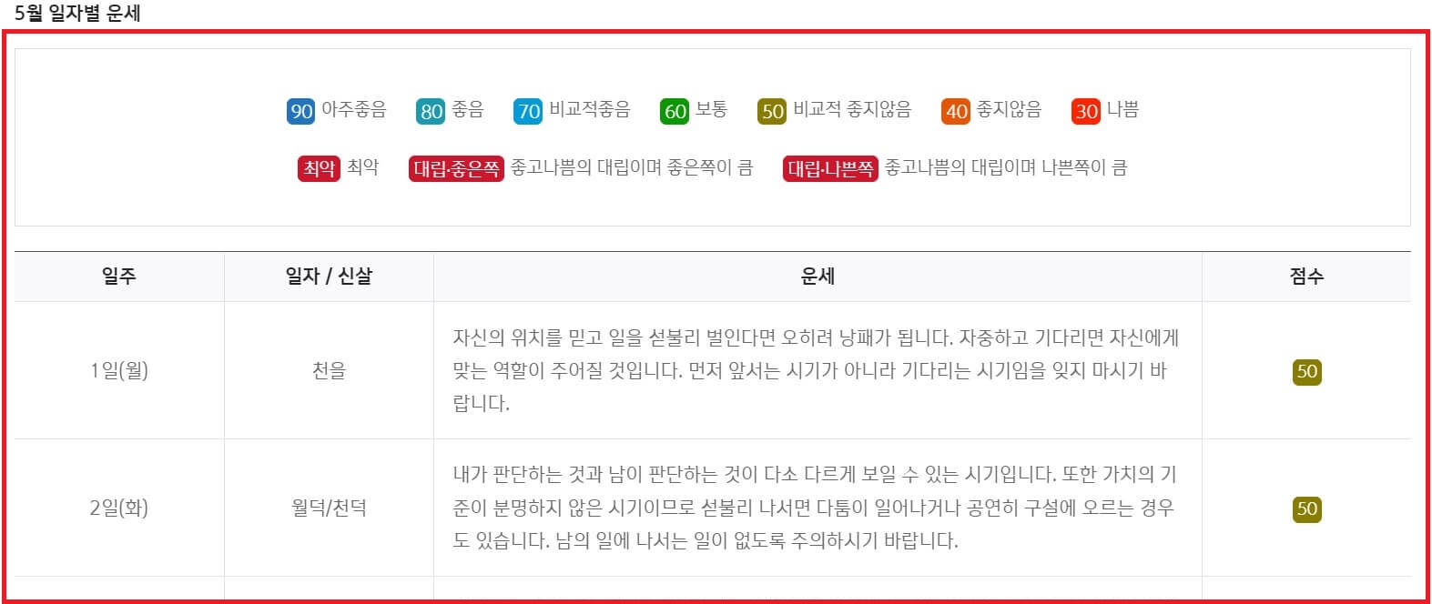 위의 사진과 같이 5월의 일자별 운세가 1일부터 31일까지 제공됩니다. 맹신할 필요는 없지만, 재미로 보기에도 꽤 재미있는 사이트라는 생각이 드네요.
