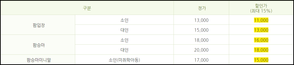| 팜승마(입장료 + 승마) | 소인 | 18,000 |