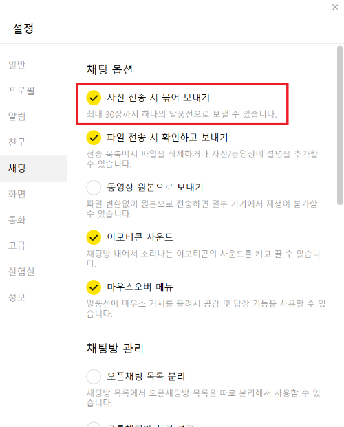 4️⃣ 채팅 옵션 중, 맨 위에 우리가 그렇게 찾던 [사진 전송 시 묶어 보내기]가 보이네요! 클릭하셔서 활성화시켜 주시면 끝입니다.