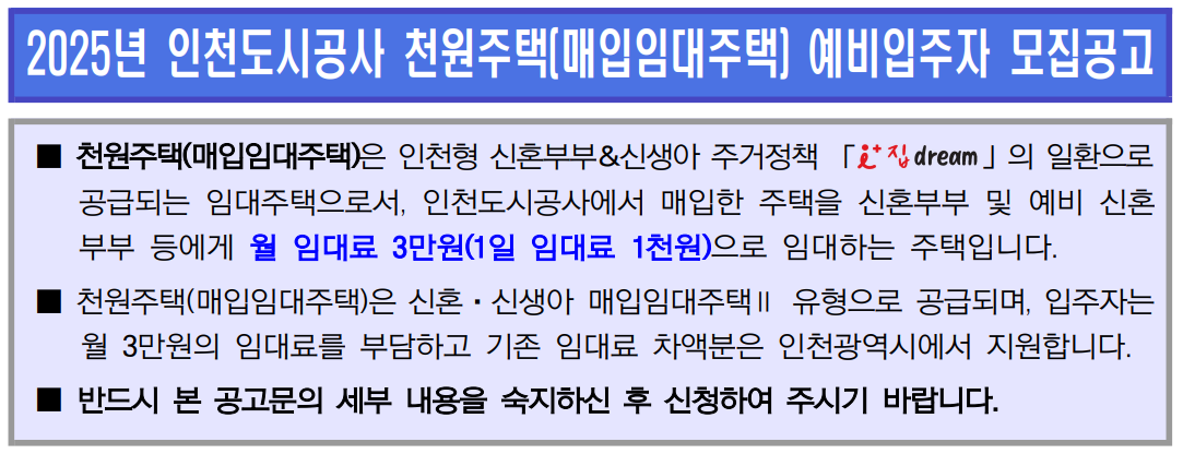 파격적인 정책인 인천 천원주택에 관심 많으신 분들 많을 텐데요. 며칠 전, 드디어 인천 천원주택 모집공고가 발표되었습니다.
