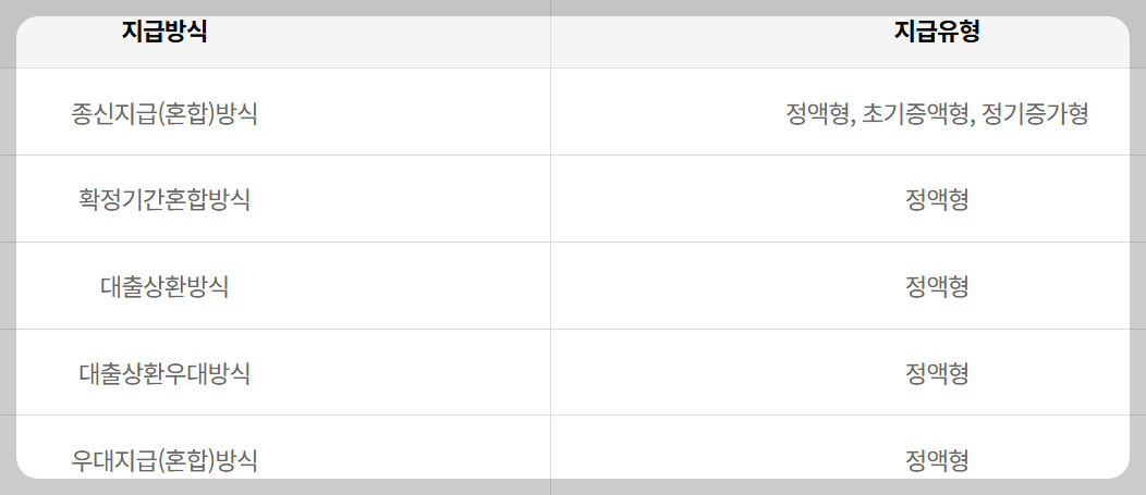 주택연금은 지급방식에 따라, 정액형과, 초기증액형, 정기증가형으로 나뉩니다. 아래 표를 보시면 이해하기가 쉬울 텐데요. 종신지급(혼합)방식만 증액형이 가능하고, 나머지 방식들은 모두 정액형으로 매월 일정한 금액을 받게 됩니다.