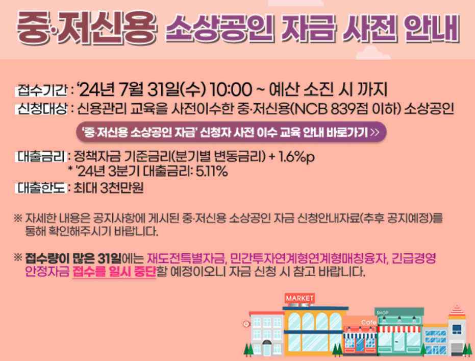 이번에 시행되는 중·저신용 소상공인 자금의 접수기간은 7월 31일 수요일 오전 10시부터 시작되며, 예산이 소진되면 바로 종료됩니다.
