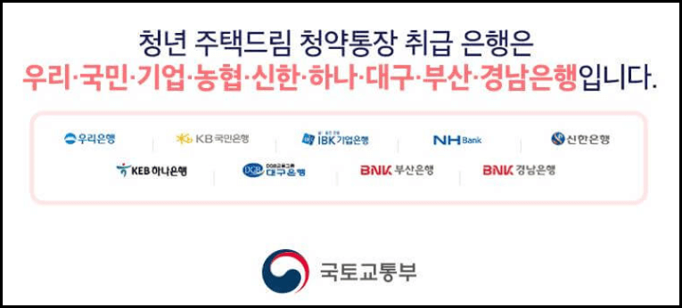 청년 주택드림 청약통장 취급은행은 우리, 국민, 기업, 농협, 신한, 하나, 대구, 부산, 경남은행, 이렇게 총 9곳입니다.