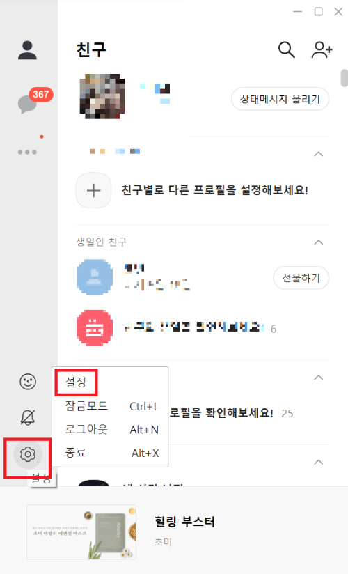 자, 그럼 카카오톡 PC 버전도 설치했으니 꼭 해야 하는 필수설정들을 말씀드려 보겠습니다. 해놓으면 좋은 필수 설정들은 다음과 같습니다. 아래 사진들도 첨부해 두었으니 사진과 함께 보시면서 설정해 보세요.