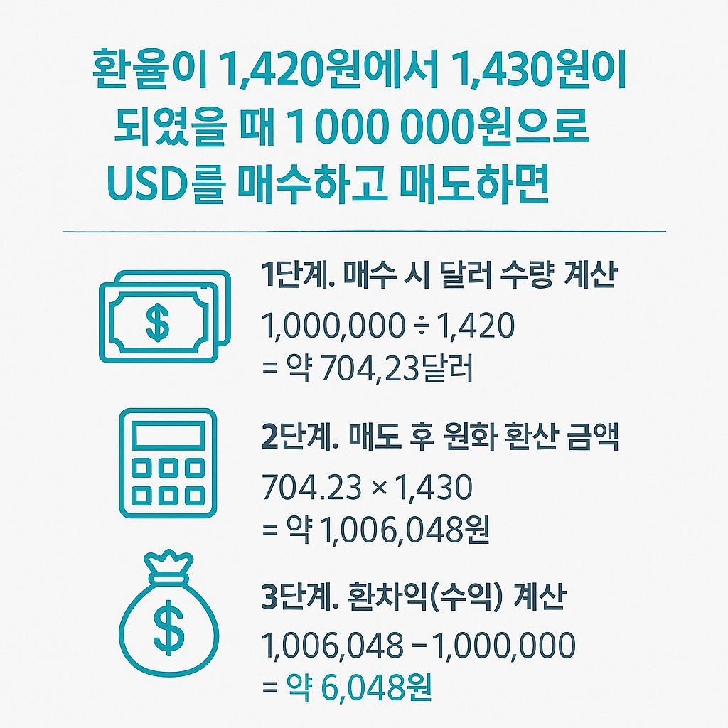 - 매수환율: 1,420원 👉 매수 가능 달러: 1,000,000 ÷ 1,420 = 704.23달러