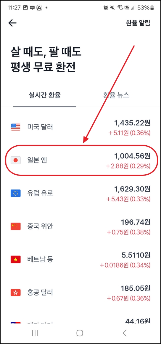 '전체 환율 보기'를 클릭하면 아래와 같은 화면이 뜨는데요. 현재 일본 엔 환율은 100엔 당 1000원이 넘은 상황입니다. 이런 상황에서는 엔화를 매수하는 건 좋은 생각이 아니니, 순서만 보여드리도록 하겠습니다.