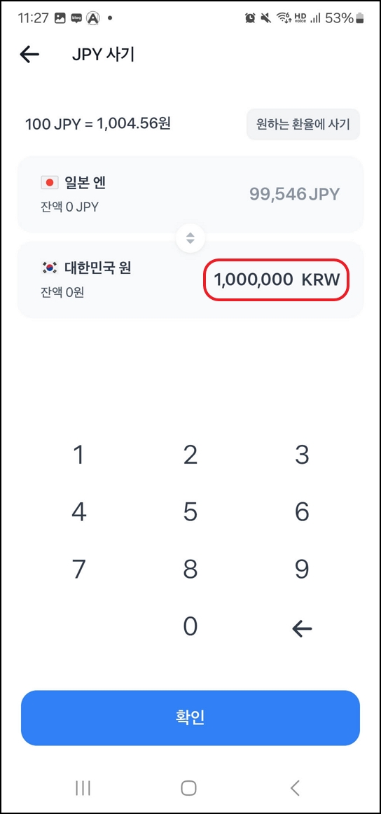'사기'를 눌러볼까요? 100만 원 환전을 하기로 했으니 '대한민국 원'에 100만 원을 입력합니다. 이렇게 입력하면, 내가 매수하게 되는 엔화가 얼마인지 나타납니다. 이상이 없다면, 확인을 누르면 매수가 완료됩니다. 매도할 때도 같은 방법으로 하시면 됩니다. 참 쉽죠?