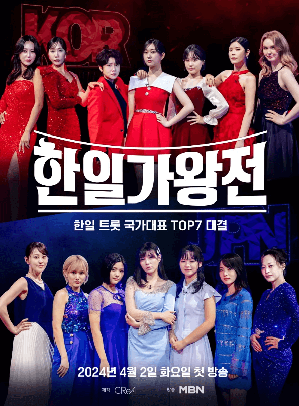 한일가왕전은 2024년 4월 2일 첫 방송을 시작으로 매주 화요일 오후 10시에 MBN에서 방송되는 프로그램입니다. 한일가왕전은 총 5회로 4월 30일이 마지막 방송일입니다.