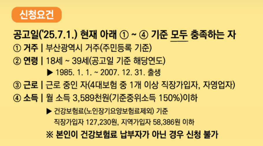 부산 청년기쁨두배통장을 신청하려면 공고일(7월 1일)을 기준으로 아래의 조건에 모두 해당되어야 합니다.