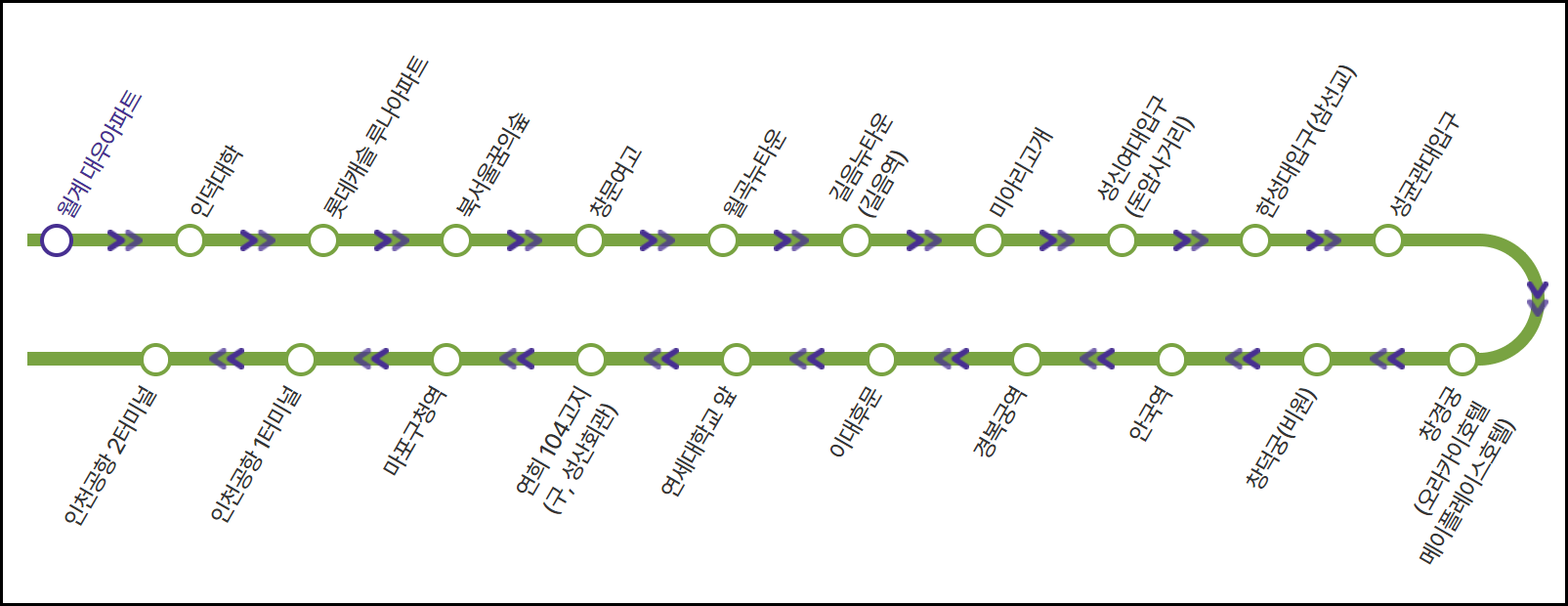 월계 대우아파트 ▶ 인덕대학 ▶ 롯데캐슬 루나아파트 ▶ 북서울꿈의숲 ▶ 창문여고 ▶ 월곡뉴타운 ▶ 길음뉴타운 ▶ 미아리고개 ▶ 성신여대입구 ▶ 한성대입구 ▶ 성균관대입구 ▶ 창경궁 ▶ 창덕궁 ▶ 안국역 ▶ 경복궁역 ▶ 이대후문 ▶ 연세대학교 앞 ▶ 연희104고지 ▶ 마포구청역 ▶ 인천공항1터미널 ▶ 인천공항2터미널