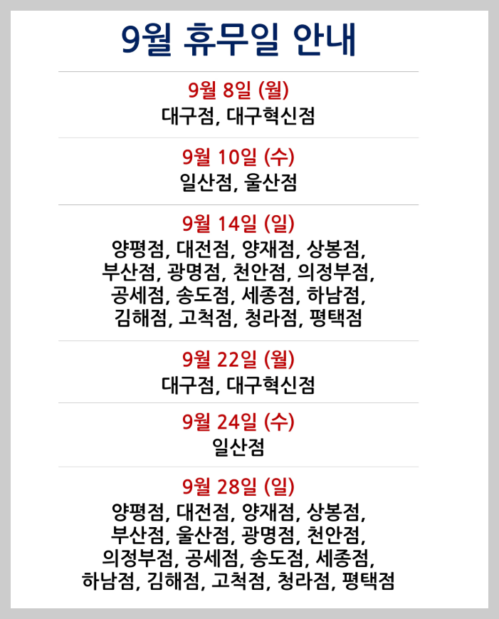 | 대구 혁신도시점 | 오전 09:30 ~ 오후 10:00 |