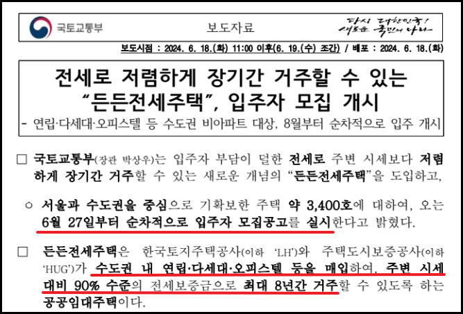 든든 전세주택은 2024년 6월 처음 등장하는 것으로, 시세의 90% 수준의 전세보증금으로 최대 8년 간 거주할 수 있으며, 소득이나 재산에 상관없이 무주택자라면 누구나 신청이 가능합니다.