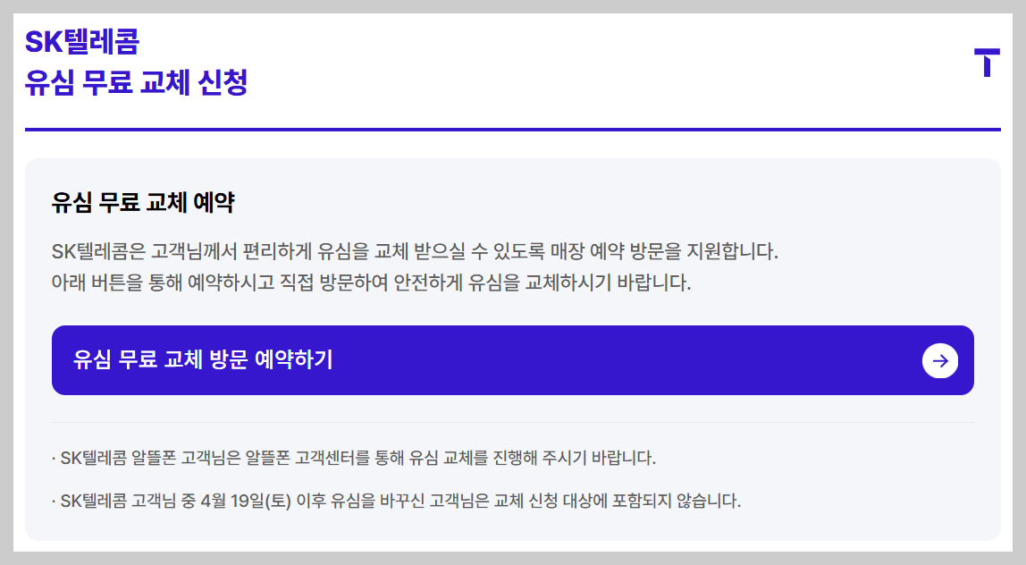 아직 유심 무상 교체 예약을 안 하신 분들은 아래 링크를 누르시고 지금 바로 예약해 두세요.